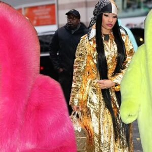 Nicki Minaj models a gold D&G trench before swapping out with two different hooded fur looks as she promotes Pink Friday 2 in NYC
