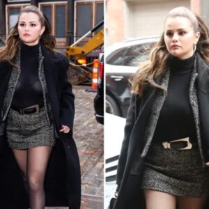 Selena Gomez nearly suffers wardrobe malfunction in very tiny skirt as she steps up curb outside NYC hotel