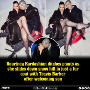 Kourtney Kardashian ditches pants as she slides down snow hill in just a fur coat with Travis Barker after welcoming son