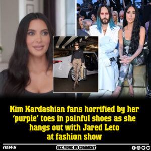 Kim Kardashian fans horrified by her ‘purple’ toes in painful shoes as she hangs out with Jared Leto at fashion show