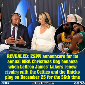 REVEALED: ESPN announcers for its annual NBA Christmas Day bonanza when LeBron James’ Lakers renew rivalry with the Celtics and the Knicks play on December 25 for the 56th time