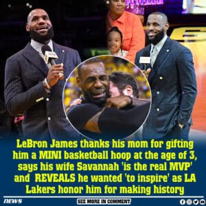 LeBron James thanks his mom for gifting him a mini basketball hoop at the age of 3, says his wife Savannah ‘is the real MVP’ and reveals he wanted ‘to inspire’ as LA Lakers honor him for making history
