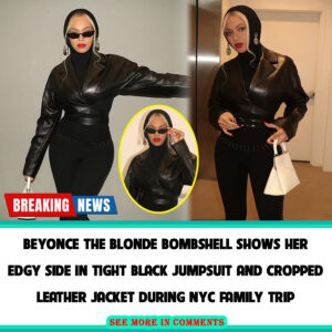 Beyonce the blonde bombshell shows her edgy side in tight black jumpsuit and cropped leather jacket during NYC family trip