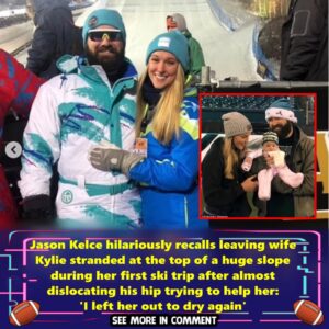Jason Kelce hilariously recalls leaving wife Kylie stranded at the top of a huge slope during her first ski trip after almost dislocating his hip trying to help her: ‘I left her out to dry again’