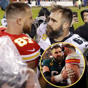 KANSAS CITY, MISSOURI – NOVEMBER 20: Jason Kelce #62 of the Philadelphia Eagles talks to brother Travis Kelce #87 of the Kansas City Chiefs after their gaмe…