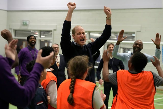 Prince William, Prince Of Wales celebrates with young people after he threw a basketball during his visit to WEST, a new OnSide Youth Zone WEST on March 14, 2024 in London, England. – Frank Augstein – WPA Pool/Getty Images