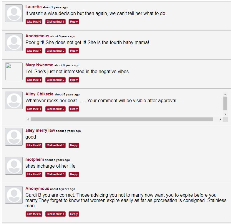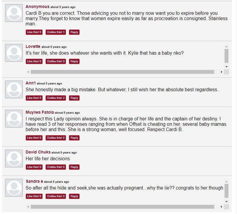 “I respect this Lady opinion always. She is in charge of her life and the captain of her destiny. I have read 3 of her responses ranging from when Offset is cheating on her, several baby mamas before her and this. She is a strong woman, well focused. Respect Cardi B.”