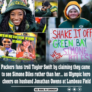 Packers fans troll Taylor Swift by claiming they came to see Simone Biles rather than her… as Olympic hero cheers on husband Jonathan Owens at Lambeau Field