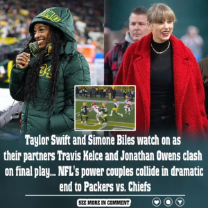 Taylor Swift and Simone Biles watch on as their partners Travis Kelce and Jonathan Owens clash on final play… NFL’s power couples collide in dramatic end to Packers vs. Chiefs