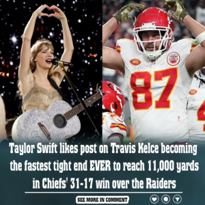 Taylor Swift likes post on Travis Kelce becoming the fastest tight end EVER to reach 11,000 yards in Chiefs’ 31-17 win over the Raiders