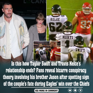 Is this how Taylor Swift and Travis Kelce’s relationship ends? Fans reveal bizarre conspiracy theory involving his brother Jason after spotting sign of the couple’s fate during Eagles’ win over the Chiefs.