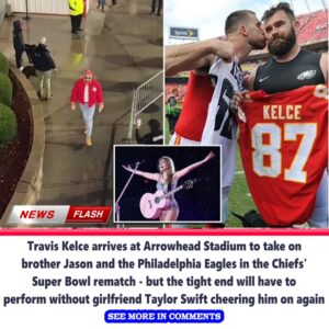 Travis Kelce arrives at Arrowhead Stadium to take on brother Jason and the Philadelphia Eagles in the Chiefs’ Super Bowl rematch – but the tight end will have to perform without girlfriend Taylor Swift cheering him on again