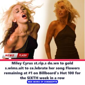 Miley Cyrus st.rip.s do.wn to gold s.wims.uit to ce.lebrate her song Flowers remaining at #1 on Billboard’s Hot 100 for the SIXTH week in a row
