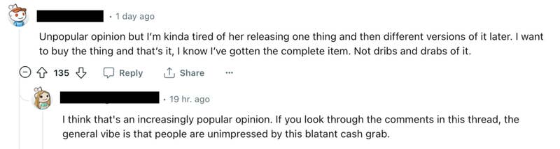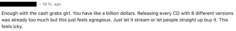 “Capitalist queen for real,” another wrote. One more agreed: “Enough with the cash grabs girl. You have like a billion dollars. Releasing every CD with 8 different versions was already too much but this just feels egregious. Just let it stream or let people straight up buy it. This feels icky.”