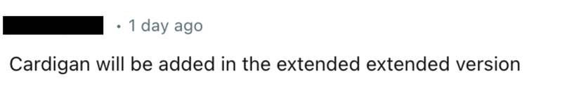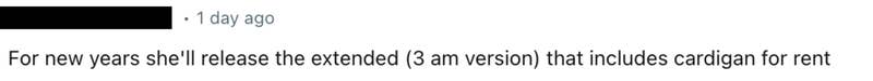 “For new years she’ll release the extended (3 am version) that includes cardigan for rent,” one joked. Another mused: “Cardigan will be added in the extended extended version.”