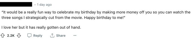 Mocking Taylor’s Instagram announcement, one person wrote: “‘It would be a really fun way to celebrate my birthday by making more money off you so you can watch the three songs I strategically cut from the movie. Happy birthday to me!’ I love her but it has really gotten out of hand.”