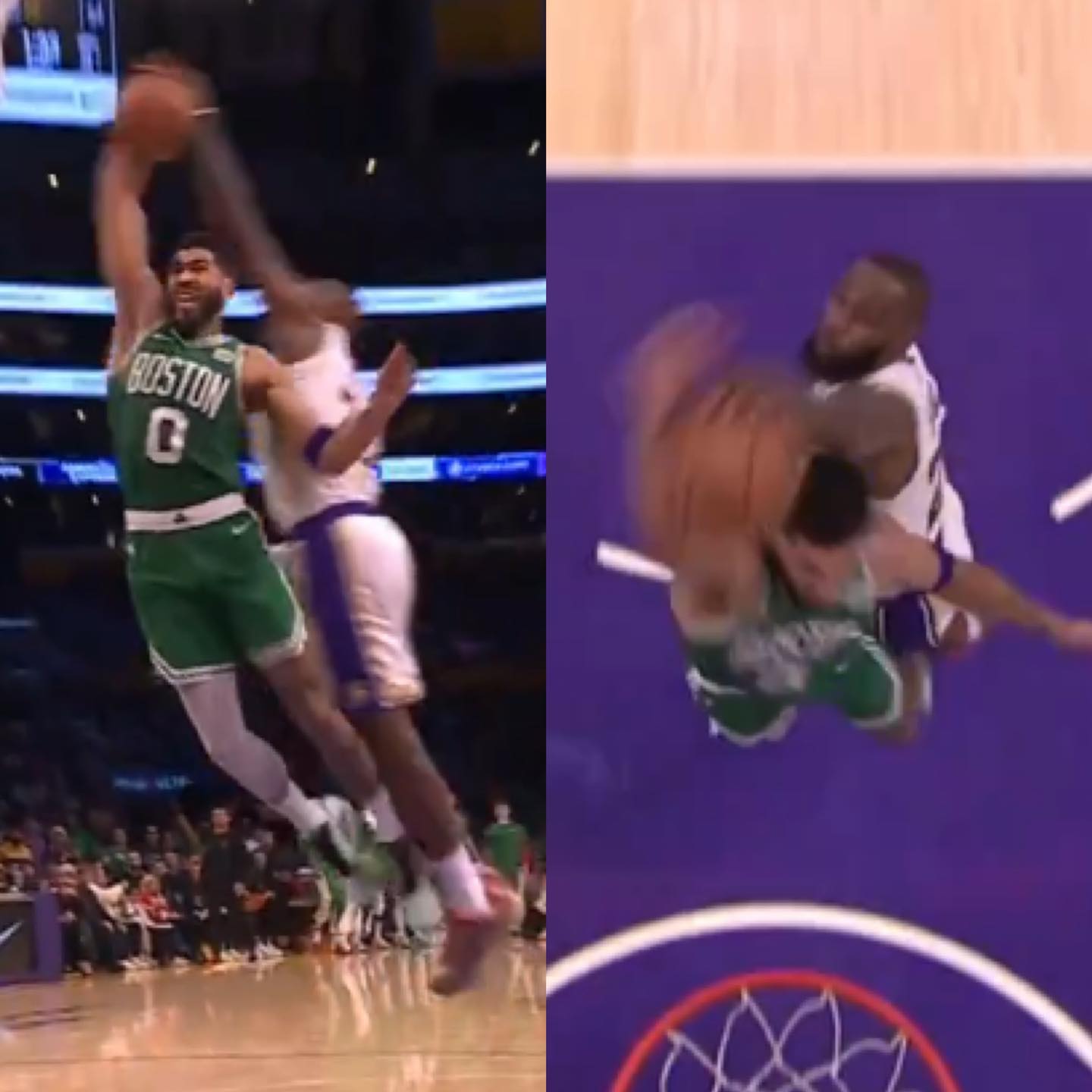 Moments after the collision, James made it clear he was feeling no ill effects by soaring for a chase-down block of Tatum. To James’s dismay, he was whistled for a foul, prompting a coach’s challenge.